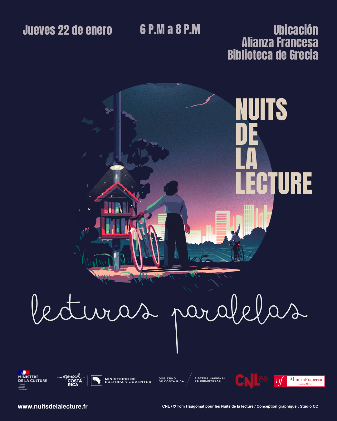 La Alianza Francesa organizará una jornada de lectura nocturna al aire libre como parte de la iniciativa Lecturas Paralelas – Nuits de la Lecture, que se realizará el jueves 22 de enero, de 6:00 p.m. a 8:00 p.m., de manera simultánea en la sede de la Alianza Francesa, en San José, y en la Biblioteca Municipal de Grecia.