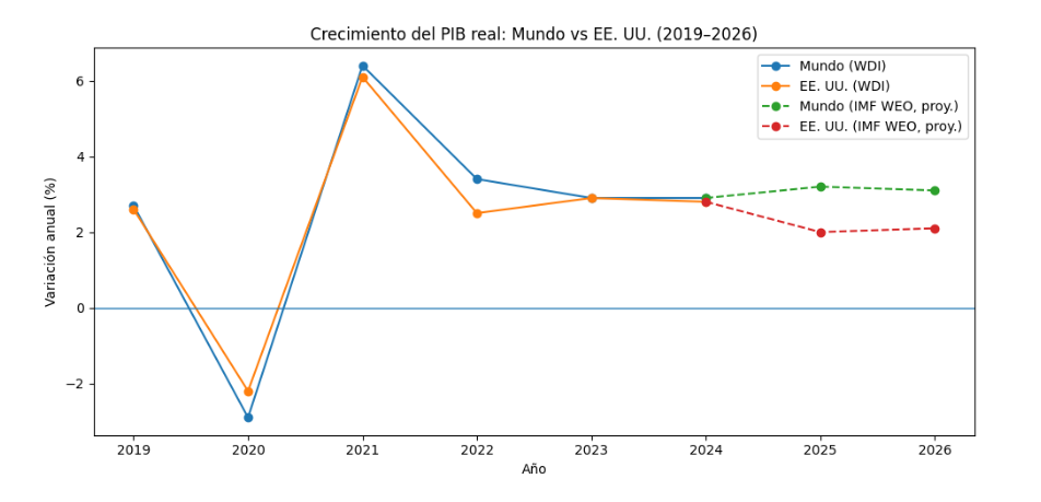 Las proyecciones internacionales para 2026 apuntan a un crecimiento económico global moderado, cercano al 3,0%, lo que refleja una economía mundial que avanza a un ritmo menor que su promedio histórico, pero con mayor estabilidad que en años recientes. Estados Unidos, nuestro principal socio comercial, jugará un papel determinante. Se espera que la economía estadounidense continúe creciendo, aunque a un ritmo más contenido, en un rango estimado entre 1,5% y 2,0%, influenciada por los siguientes factores: