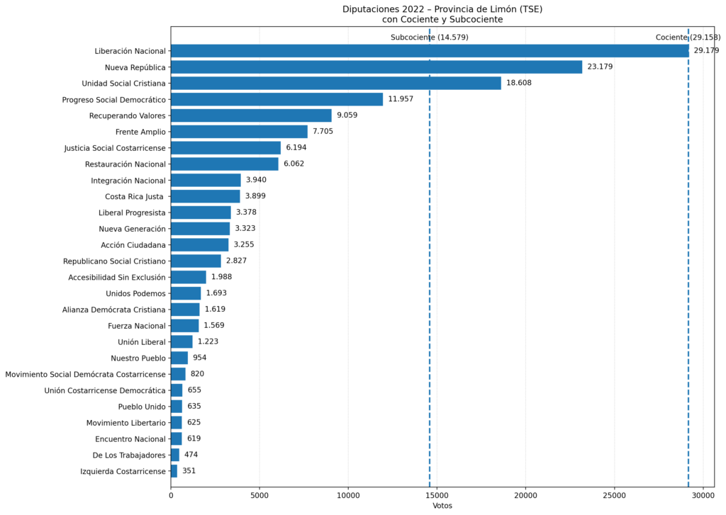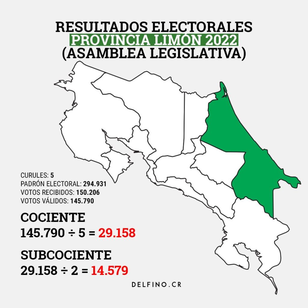En 2022 en Limón se contabilizaron 145.790 votos válidos. El Tribunal Supremo de Elecciones lo que hace es tomar ese número (que recordemos no incluye votos nulos y en blanco) y lo divide entre la cantidad de curules que tiene la provincia. En el caso de Limón, como dijimos, son cinco.