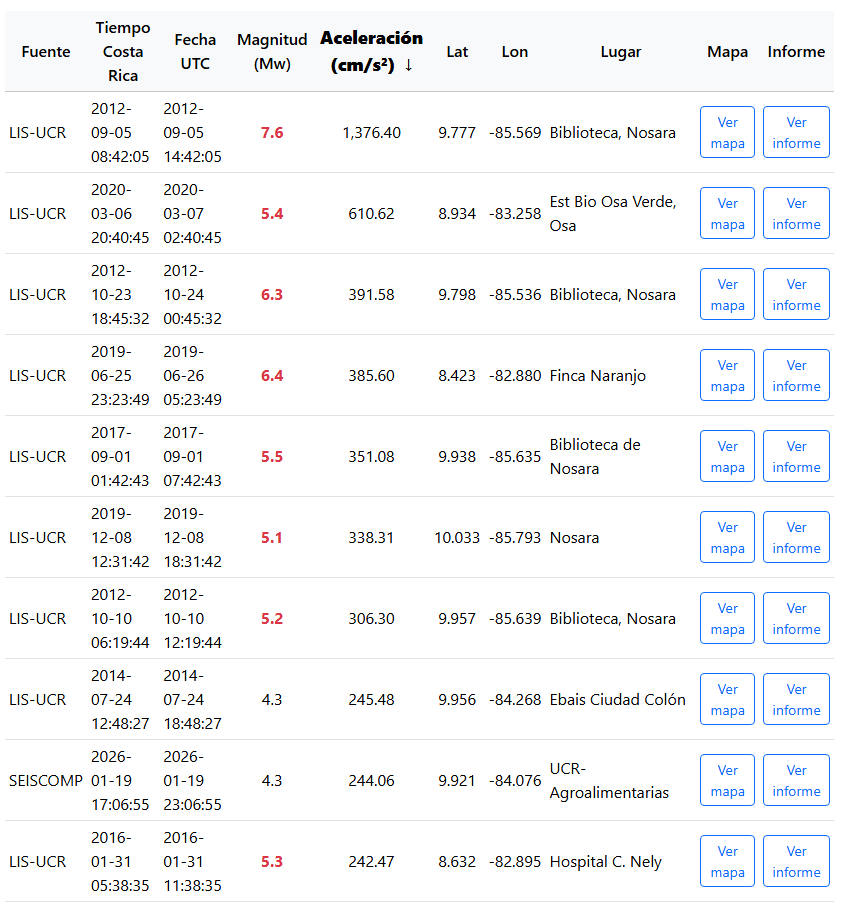 Lista de los 10 sismos con sacudidas más fuertes registrados por el LIS-UCR. El sismo de este lunes es el noveno más fuerte.