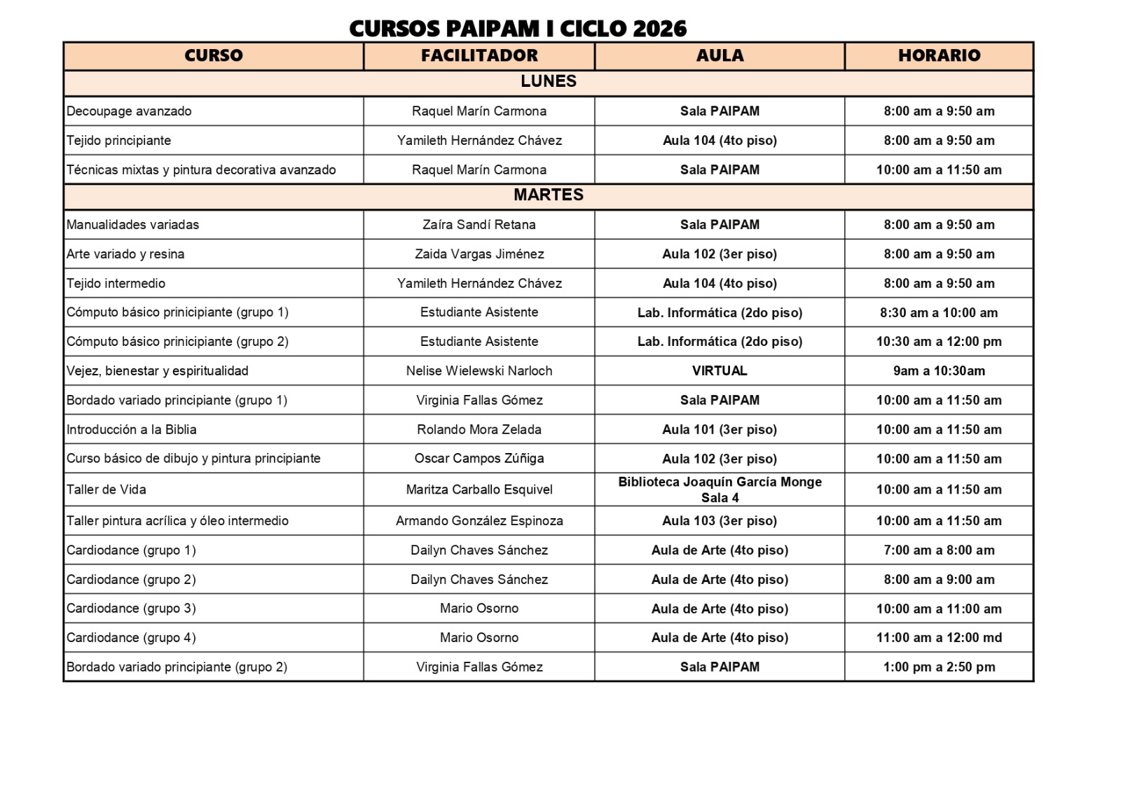 Las inscripciones fuera del período oficial no se tramitarán y la entrega de documentos forma parte del proceso regular posterior a la matrícula virtual. El detalle completo de los cursos y horarios puede observarse en la siguiente tabla: