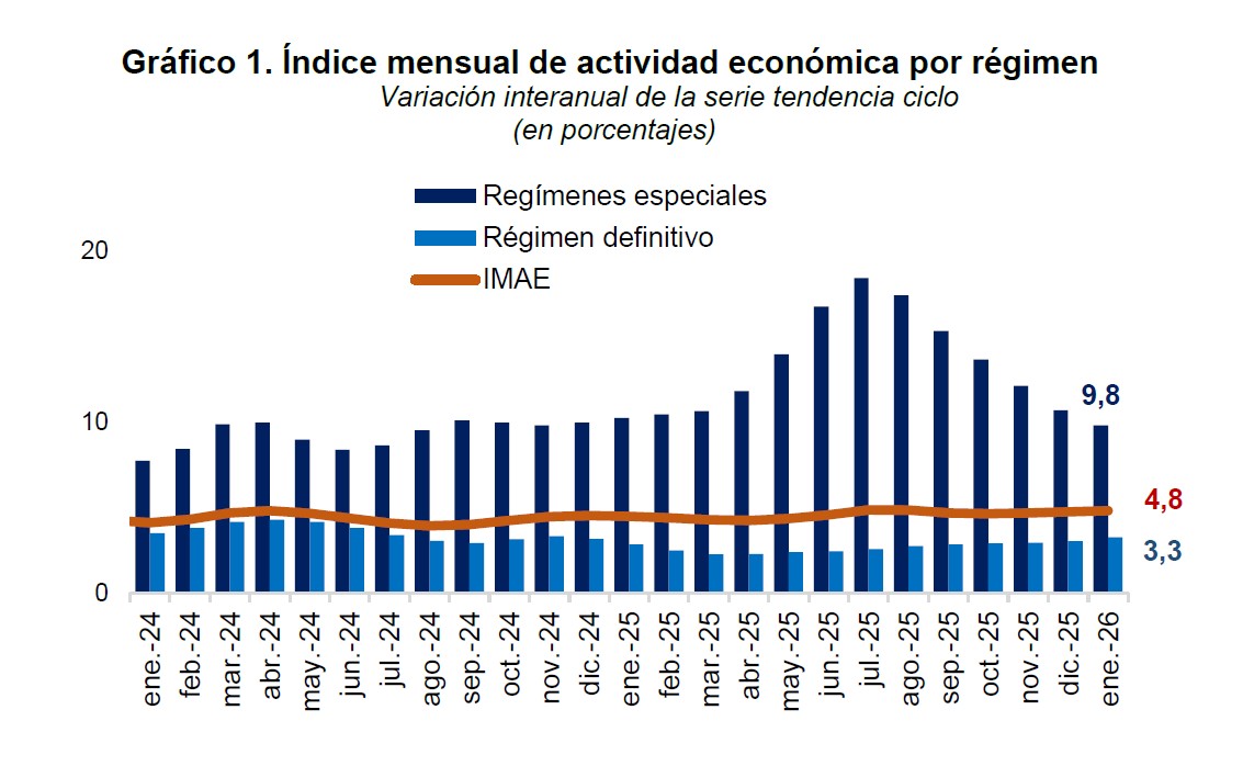 El informe destaca que la variación interanual del régimen definitivo (consumo interno y exportaciones que no son de zonas francas) fue de 3,3%, lo que representó una contribución del 60,8% a la variación del IMAE, mientras que para los regímenes especiales (zonas francas) el incremento fue de 9,8%, representando el 39,2% de la variación del IMAE.