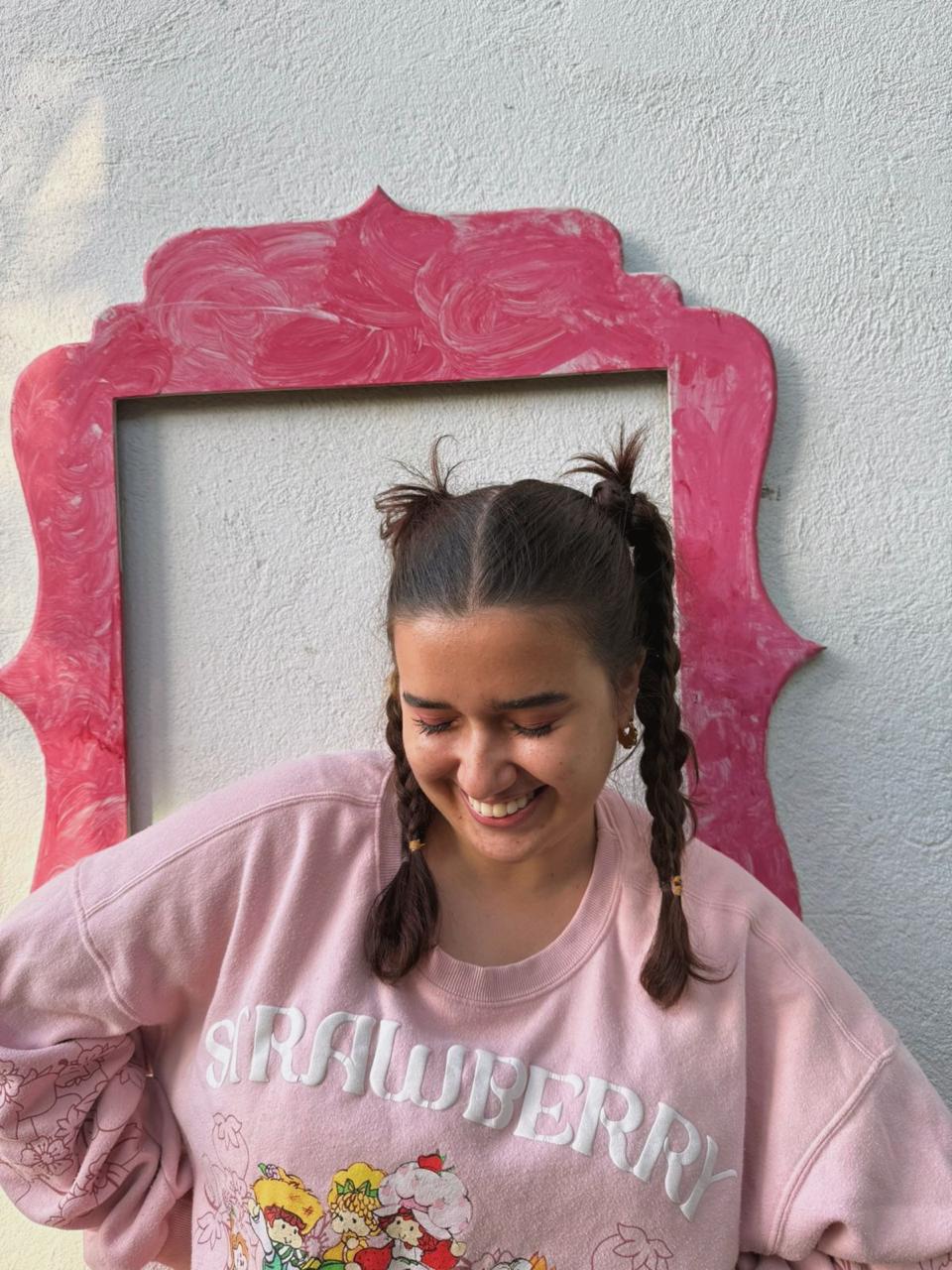 Descripción: Fotografía facilitada por Jimena. En la imagen, ella expresa que se siente auténtica y cómoda consigo misma, destacando la presencia de colores vibrantes —especialmente el rosado—, que le generan una sensación positiva. También resalta su peinado, inspirado en estilos que admiraba desde niña en películas animadas, y que hoy le permite reconectarse con una parte de su identidad.